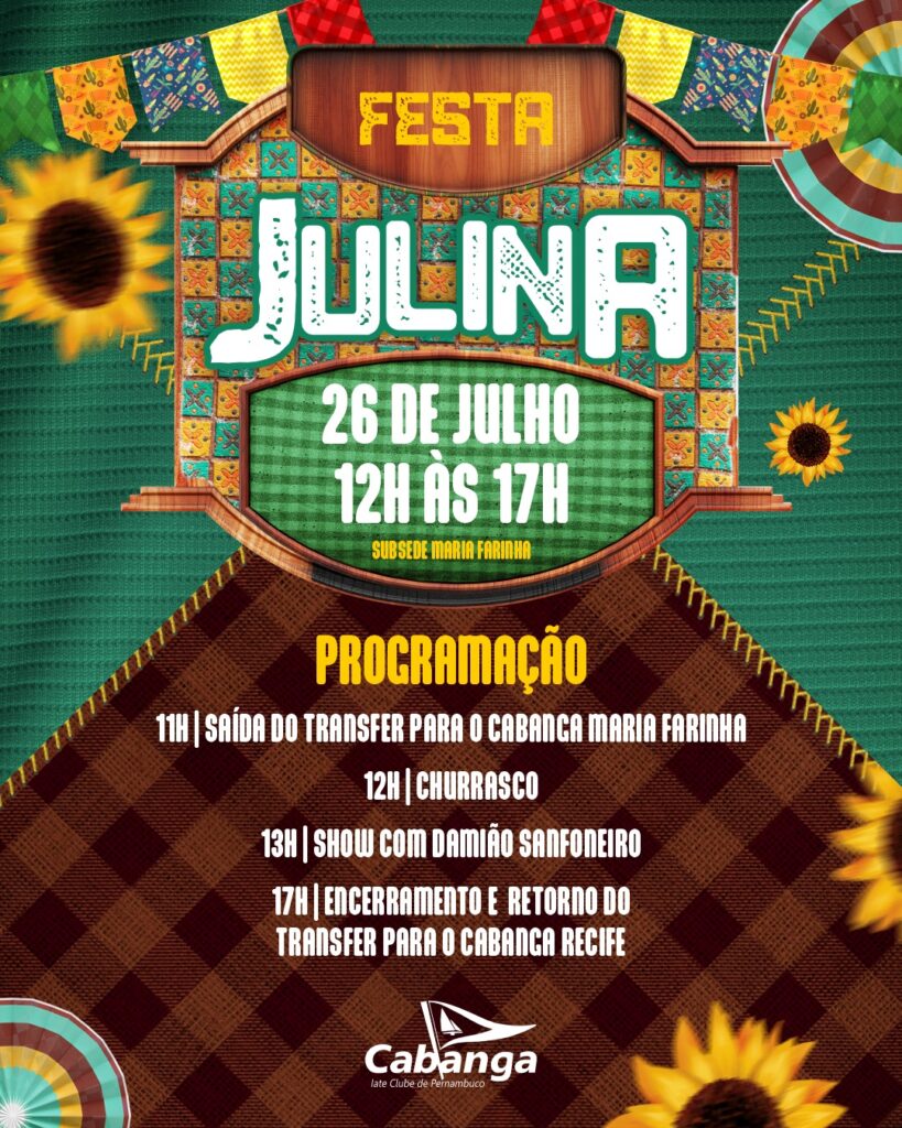 Ainda tem forró no Cabanga! Neste sábado (26/07), vamos encerrar em grande estilo os festejos de São João e São Pedro com a Festa Julina na Subsede de Maria Farinha.
