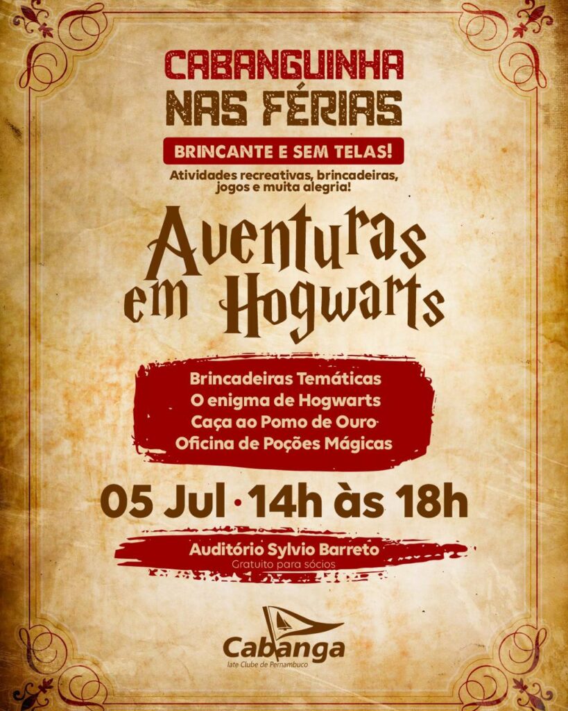 Cabanguinha nas Férias! Diversão garantida para a criançada nos sábados de julho! Na abertura da nossa programação, neste sábado (05/07), venha vivenciar as Aventuras de Hogwarts.