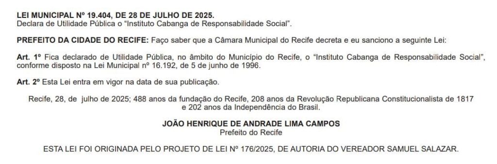 O Instituto Cabanga de Responsabilidade Social, organização dedicada a fomentar o desenvolvimento social e a cidadania, celebra uma importante conquista: o reconhecimento oficial como Utilidade Pública através da aprovação do Projeto de Lei Nº 176/2025, sancionado pelo Prefeito do Recife João Campos. A certificação foi publicada no Diário Oficial do Município nesta terça-feira (29/07) e atesta o compromisso da instituição com a comunidade, além de abrir novas portas para a ampliação de suas ações e projetos.
