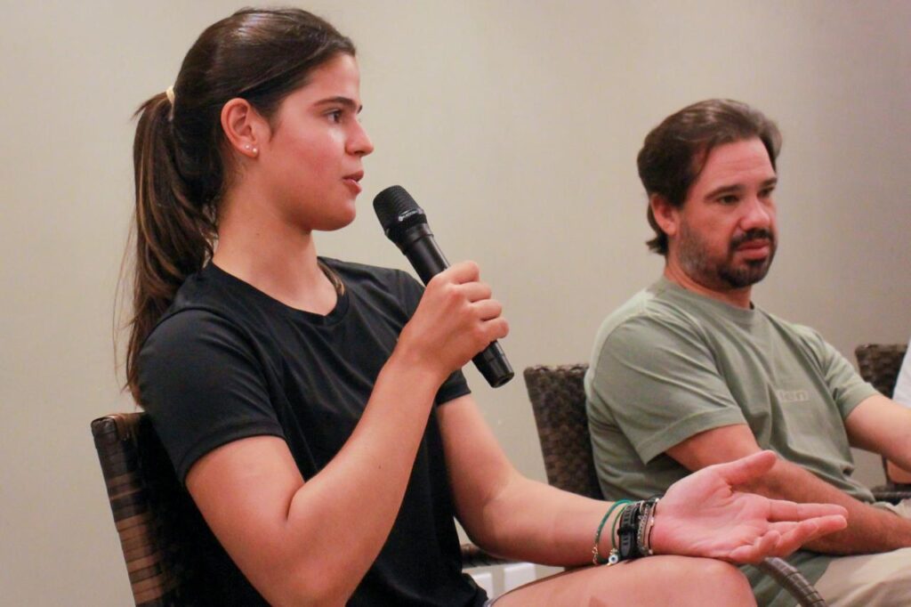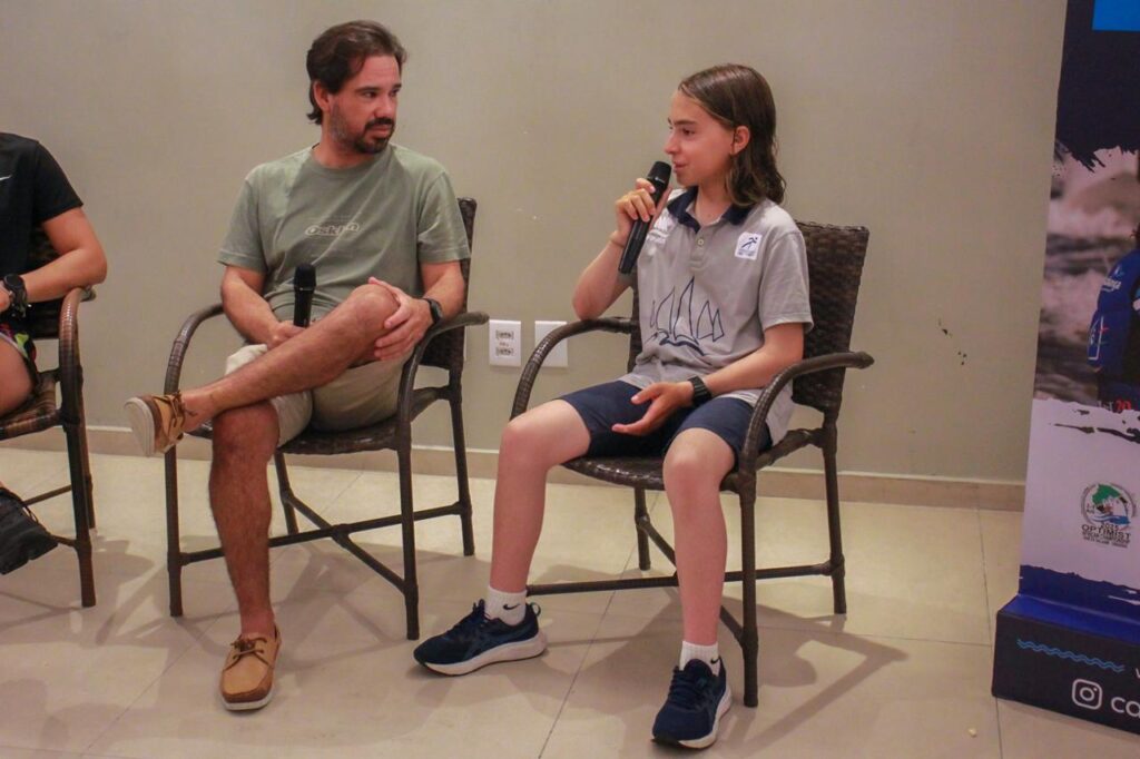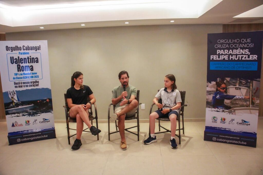 A dupla falou um pouco da experiência de competições internacionais. Valentina, de 16 anos, acaba de conquistar um 4º lugar no Campeonato Mundial Júnior de Ilca 6 em Los Angeles. Já Felipe Hutzler, 13 anos, foi campeão do Campeonato Africano de Optimist na semana passada.