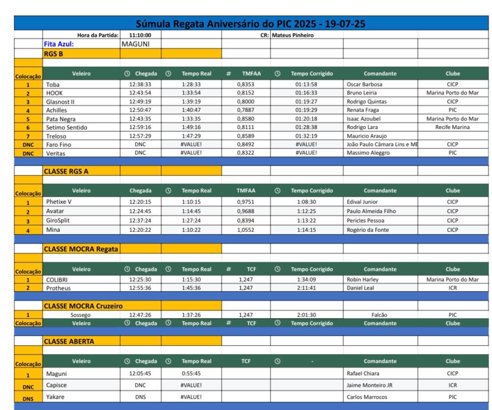O veleiro Maguni, do comandante Rafael Chiara, foi o Fita Azul da Regata em comemoração dos 76 anos do Pernambuco Iate Clube (PIC). A prova foi disputada no sábado (19/07).