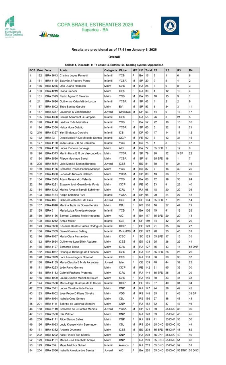 Quatro regatas já foram disputadas. Daniel Acioli, apoiado pelo Instituto Cabanga de Responsabilidade Social, está em 13º no geral – 8º no Infantil. Já Eugênio da Fonte está em 22º (10º no Mirim).